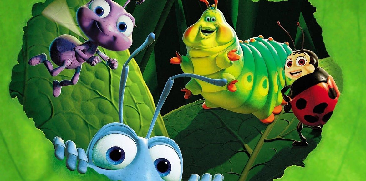 افتتاحية الفلم تصور لنا تفشي حالة ذعر وتوتر بسبب أمر يستغربه المُشاهد. مجموعة من النمل يمشي في صف مستقيم حاملاً الطعام إلى الوجهة المطلوبة، وفجأة تنطلق صرخة تطلب النجدة... لقد أعترض طريقهم ورقة شجرة سقطت من أعلى دون حول أو قوة! فنجد النمل العادي يخاف من اتخاذ قرار بنفسه ويسبب الذعر بينه وبين باقي النمل بسبب ورقة صغيره اعترضت طريقهم. لم يجد أحد التصرف على الرغم من سذاجة الموقف. وفي مشهد آخر ولية العهد في حالة ذعر أيضاً خشية أنّ يحدث شيء ويفسد جمع الطعام قبل وصول ملك الجراد الظالم. تتجول يمنه ويسره حائرةً من أمرها، تضع الملكة يدها على كتف الأميرة مهدئةً لها. في كلا المشهدين لا يوجد تصرف فردي، بمعنى جماعة النمل لم تعرف التصرف أمام ورقة وطلبوا المساعدة وولية العهد تعتمد في كل صغيرة وكبيرة على الملكة.